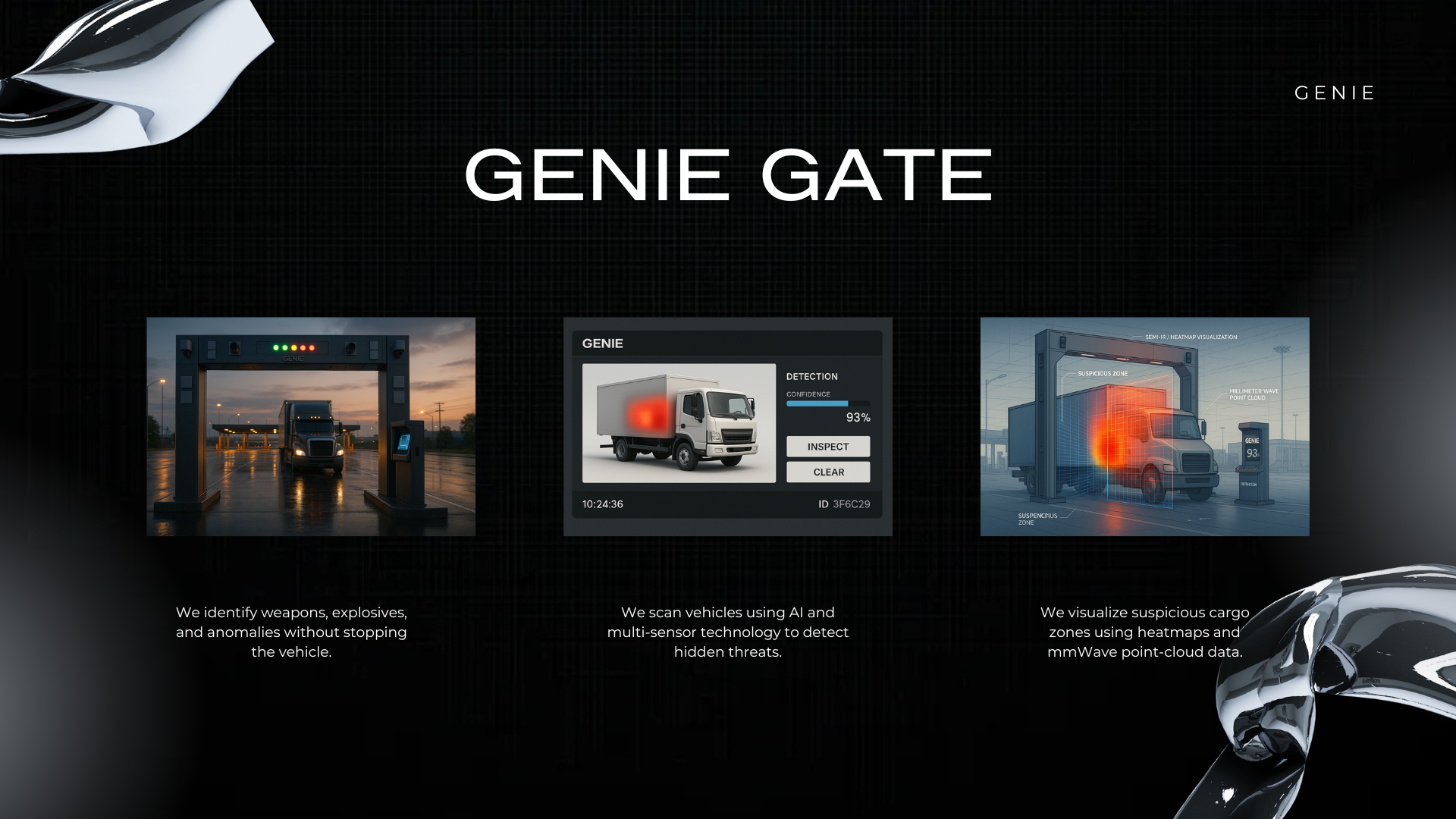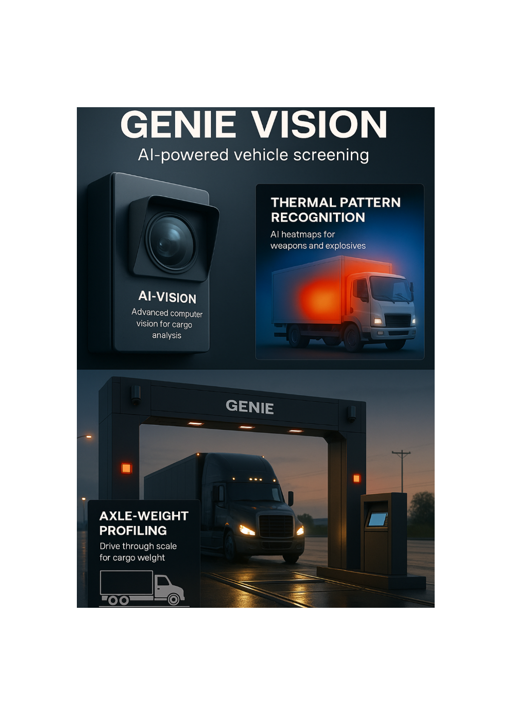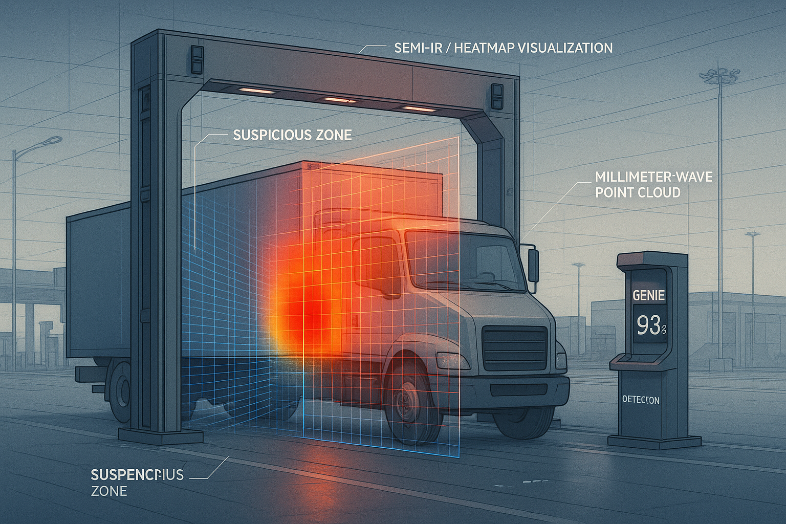 AI-powered Genie Gate scanning trucks in real time using mmWave and heatmap technology to identify suspicious zones without stopping the vehicle.